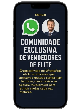 Grupo privado no WhatsApp onde vendedores que aplicam o método compartilham técnicas, casos reais e se apoiam mutuamente para atingir metas cada vez maiores.